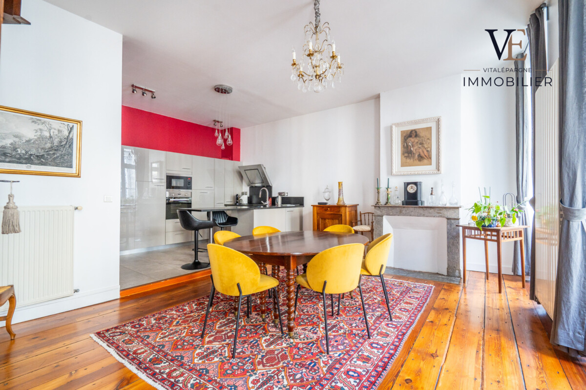 Une cuisine ouverte sur salle à manger, un lumineux salon ainsi qu’une vaste pièce, (ancienne une chambre), actuellement exploitée comme bureau. Le tout dispose de nombreuses portes-fenêtres permettant l’accès aux balcons et le bénéfice d’une belle lumière naturelle.