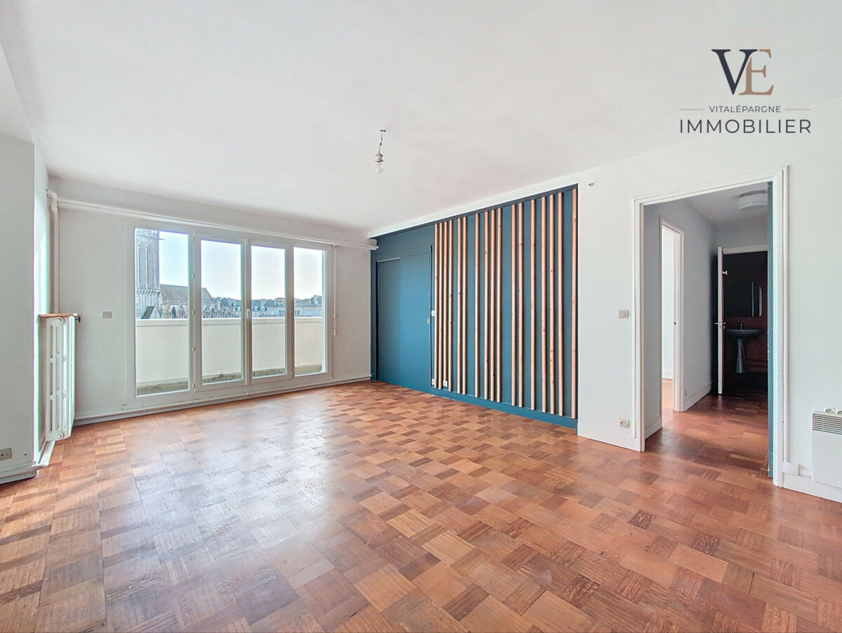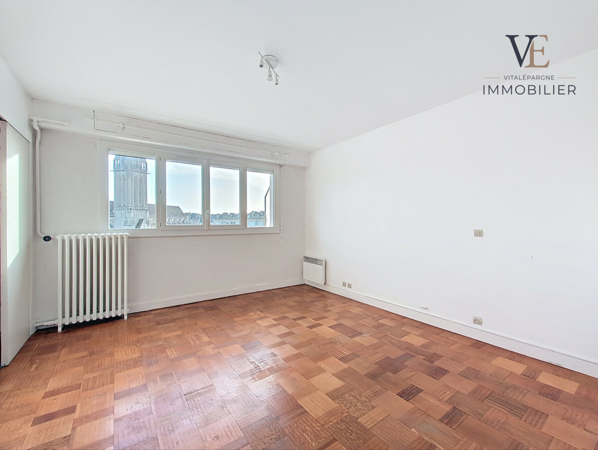 Situé en plein cœur du centre-ville de Caen, quartier des Quatrans, cet appartement de 71,30 m² situé au 5ème étage avec ascenseur vous offre une belle opportunité avec une vue exceptionnelle sur l’église Saint-Pierre. L'appartement se compose d'une entrée menant vers un grand séjour avec accès direct à un balcon spacieux, une chambre de belle taille, une salle de bain ainsi qu’une cuisine séparée.. Copropriété de 246 lots dont 130 principaux, 1500 € de charges annuelle, pas de procédure en cours.