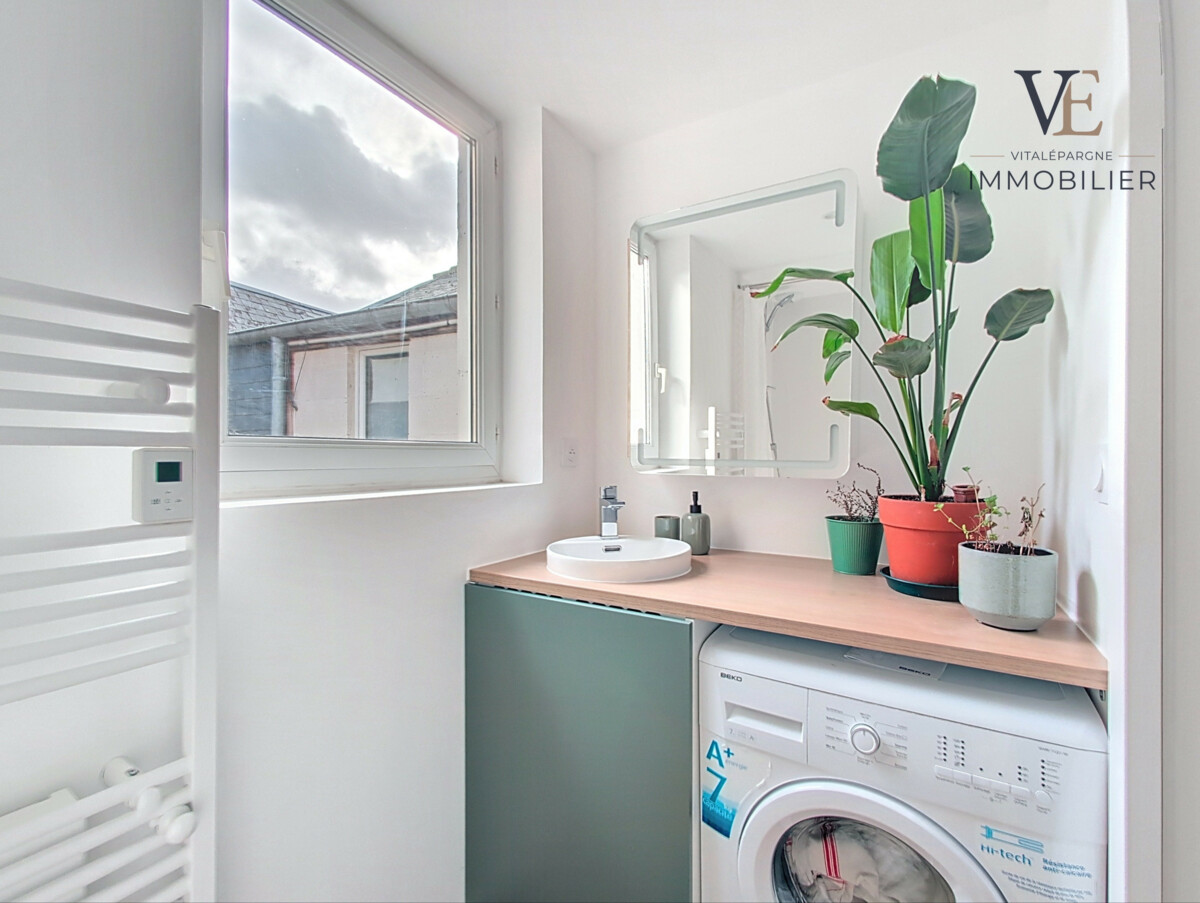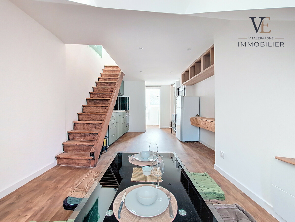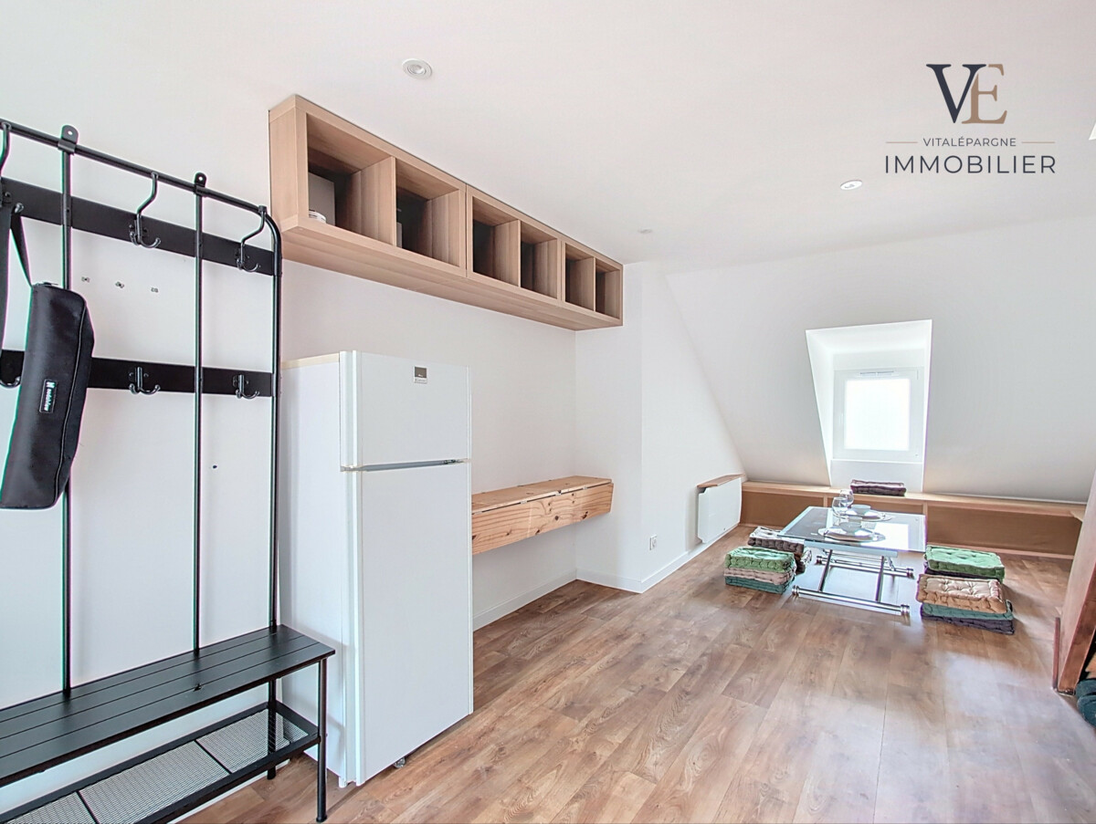 Entièrement rénové en 2023 avec des matériaux de qualité, cet appartement offre une entrée desservant une salle d’eau, un WC séparé ainsi qu’une agréable pièce de vie avec cuisine équipée (four, plaques de cuisson, réfrigérateur avec congélateur et lave-vaisselle). Le logement est proposé avec un mobilier soigné et fonctionnel, comprenant notamment une table à manger modulable et un lave-linge.