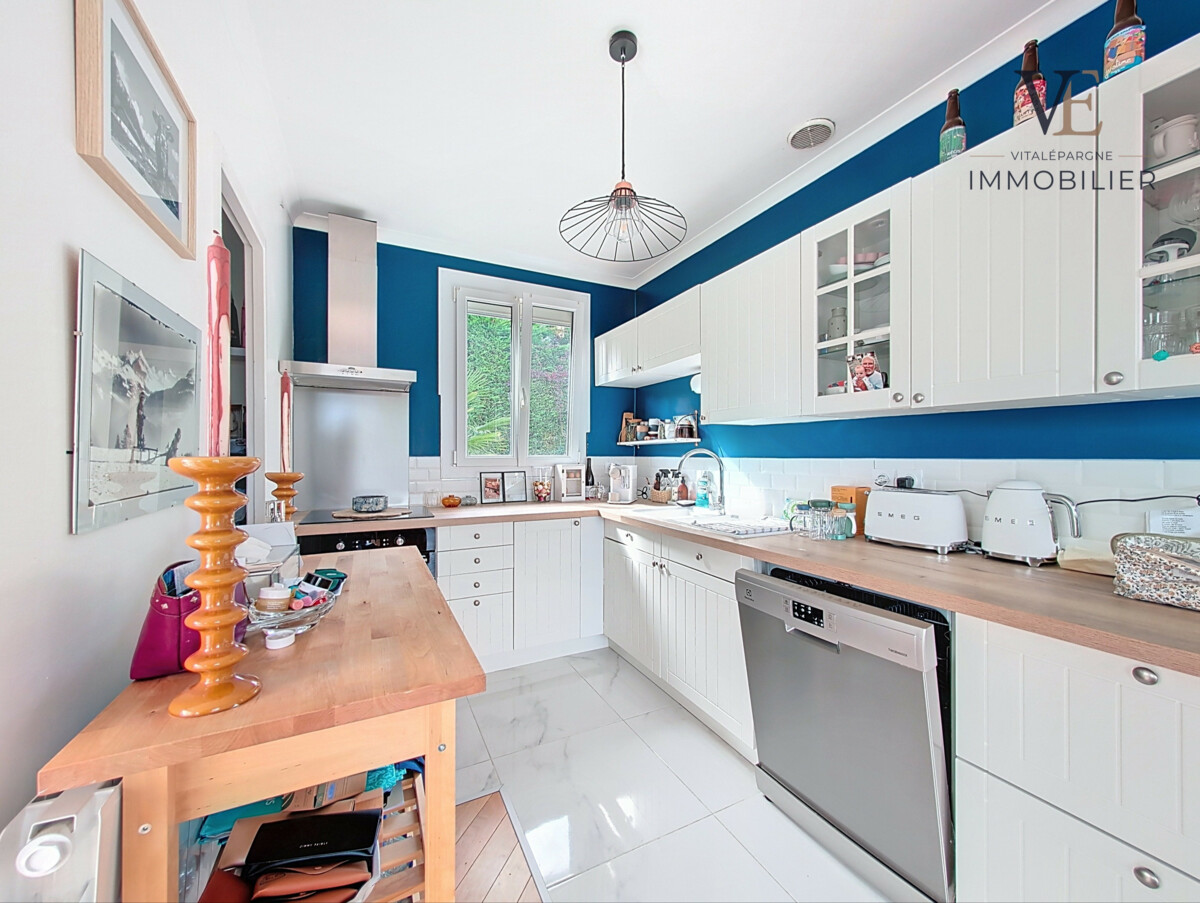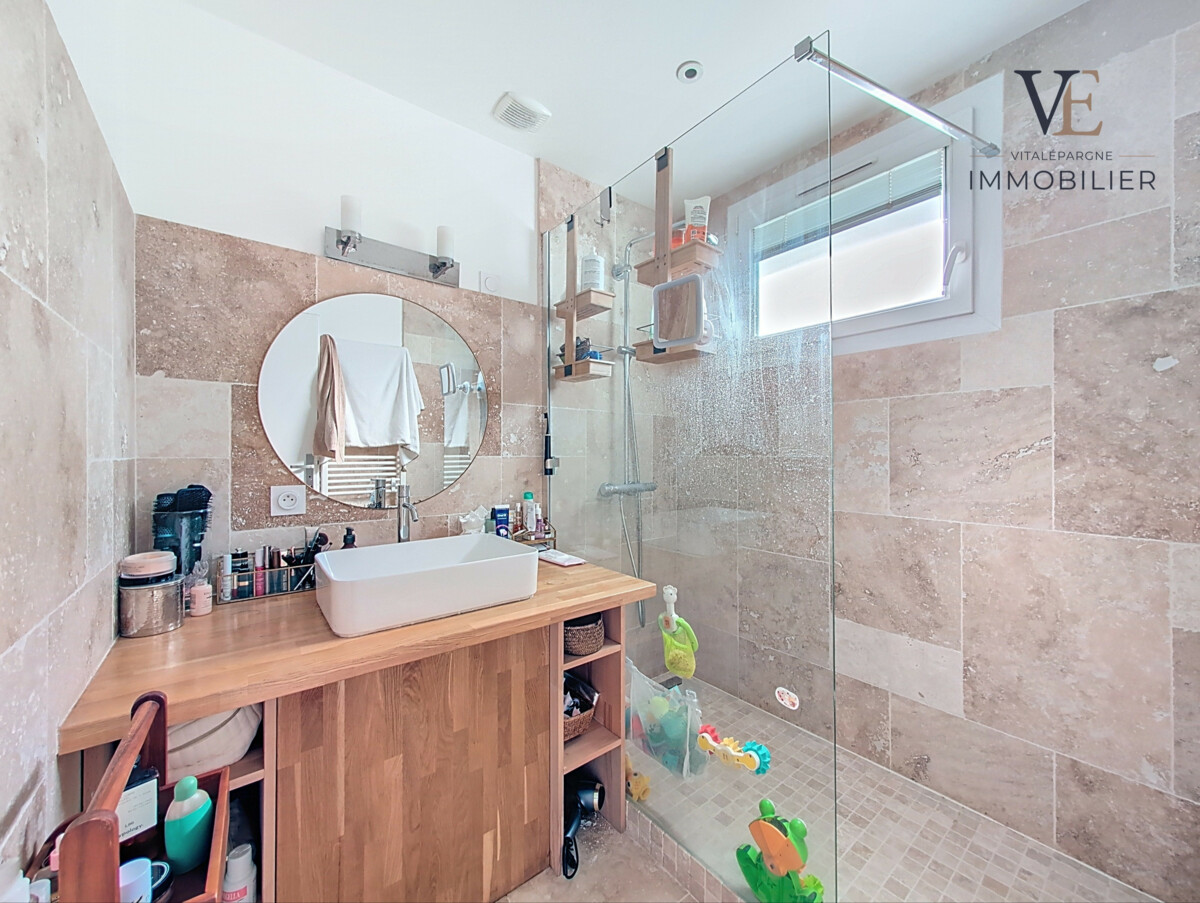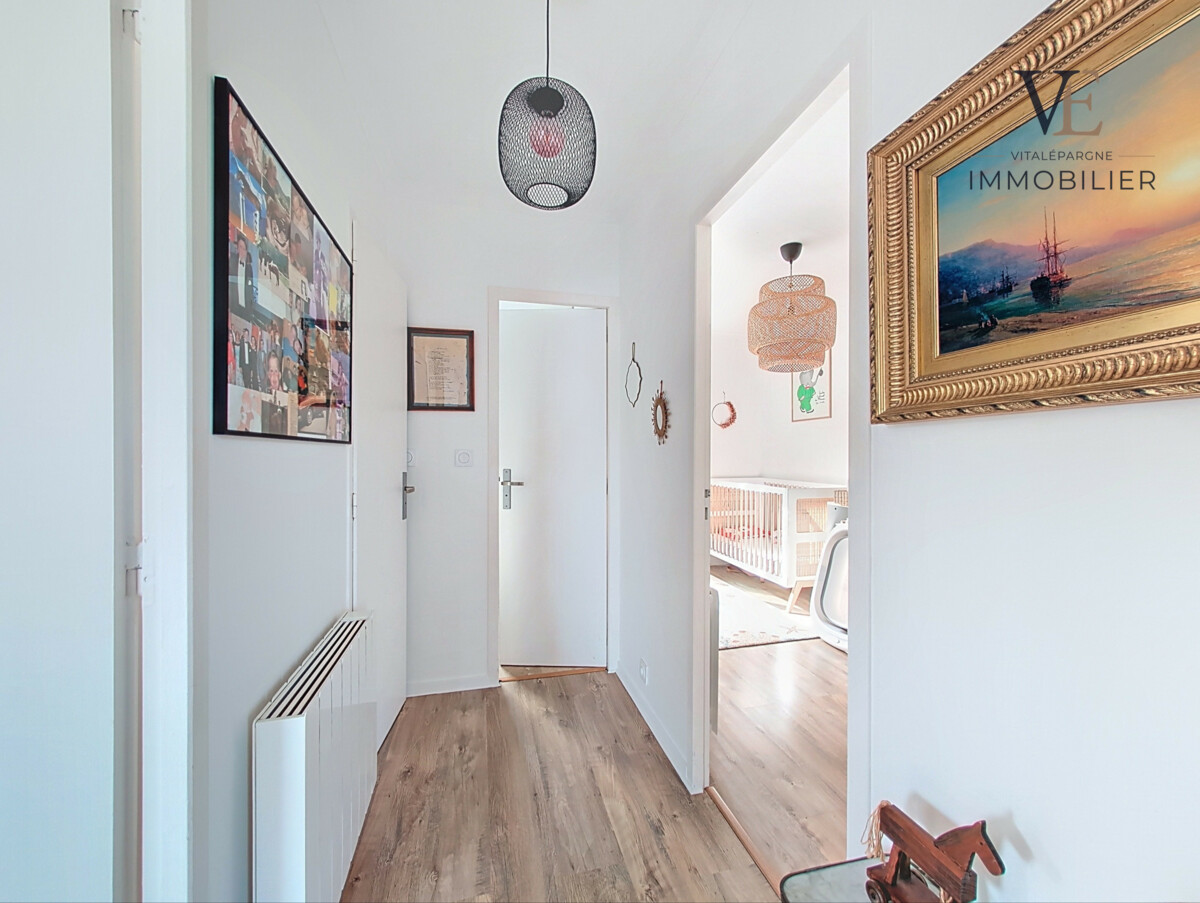 Une entrée avec placard, ouverte sur une vaste pièce de vie lumineuse de 30 m² avec cuisine équipée (lave-vaisselle, four, plaques induction, réfrigérateur-congélateur, lave-linge) et arrière-cuisine.