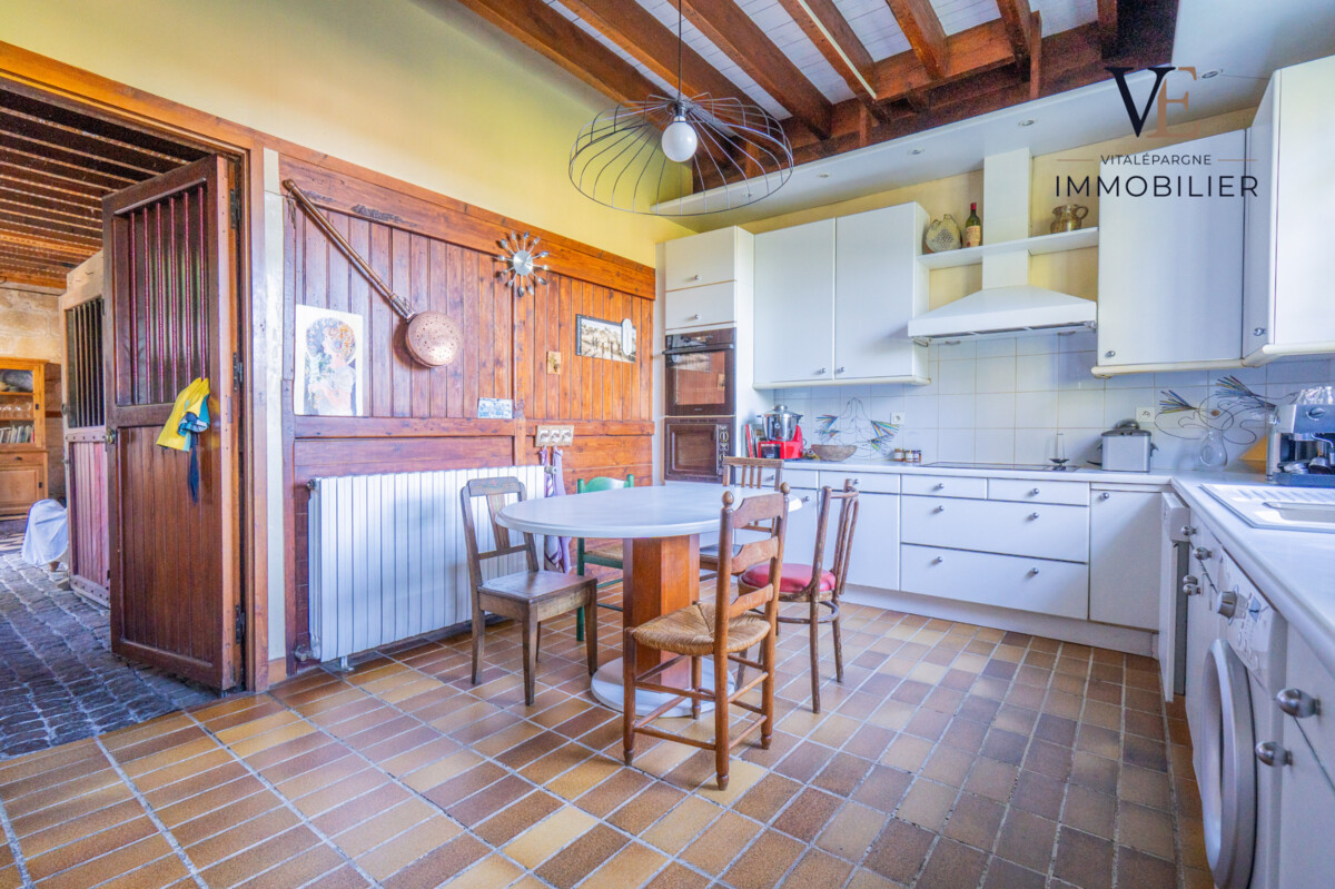 Au rez-de-chaussée, vous découvrirez une entrée chaleureuse, un séjour traversant de plus de 40 m² avec cheminée, une salle à manger ainsi qu'une cuisine indépendante. Une vaste pièce supplémentaire, chauffée et d'environ 50 m², conservant ses anciens box à chevaux, complète ce niveau et présente un fort potentiel d'aménagement.