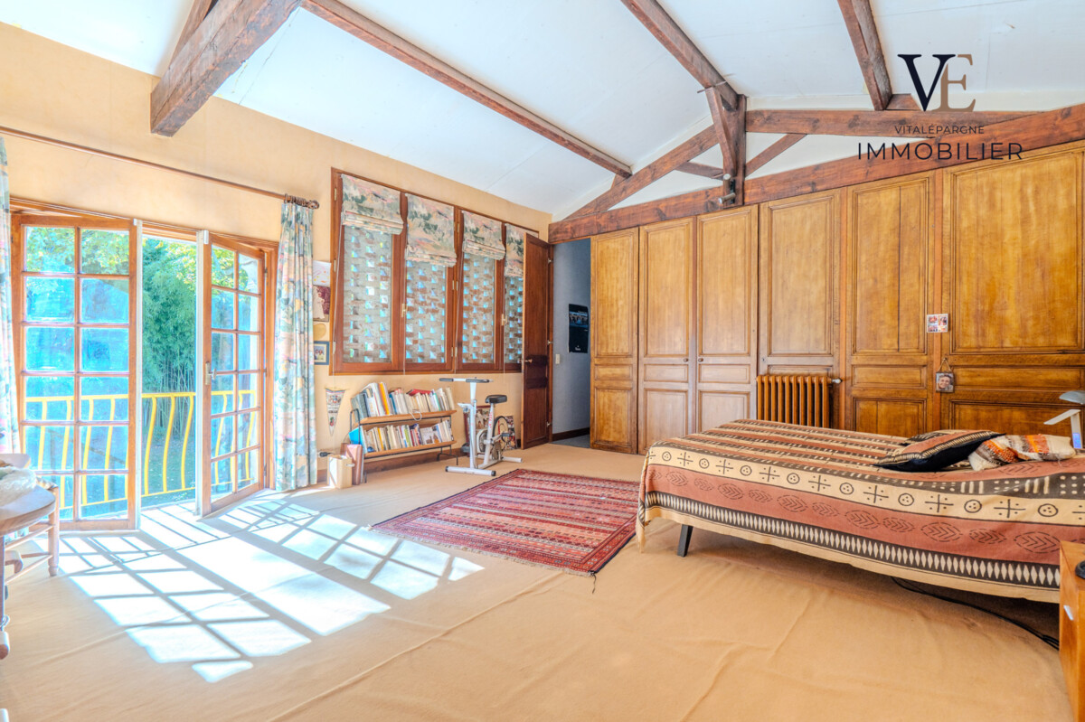 L'étage est accessible par deux escaliers distincts permettant de circuler librement et créer des espaces indépendants. Il se compose de cinq chambres, un bureau, deux salles de bains, deux WC ainsi qu'une pièce aveugle permettant des rangements supplémentaires. A noter que l'ensemble de cet étage peut être entièrement ré-agencé.